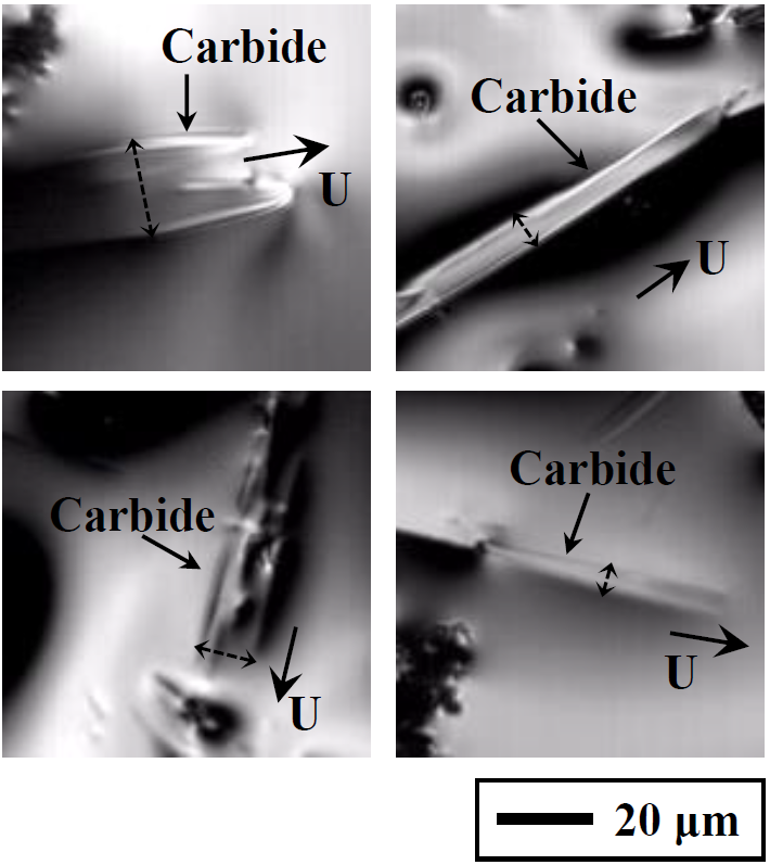 纵向生长的四种碳化物的代表图像,显示了生长方向(U)和针状碳化物厚度(2ro)。