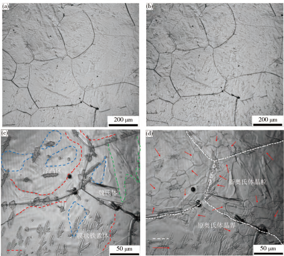 使用高温激光共聚焦显微镜(VL2000DX-SVF17SP,最新型号为VL3000DX-SVF18SP)原位验证观察表明:含NbJ55钢在双相区700℃热装(即高于Ar3温度,简称热装)时,组织为晶界膜状先共析铁素体、魏氏体和大量残留奥氏体,再加热至1200℃,奥氏体晶粒大小、位置都不变;在单相区600℃温装(即低于Ar1温度,简称温装)时,组织为大量铁素体+珠光体,再加热至1200℃时,奥氏体晶粒明显细化。