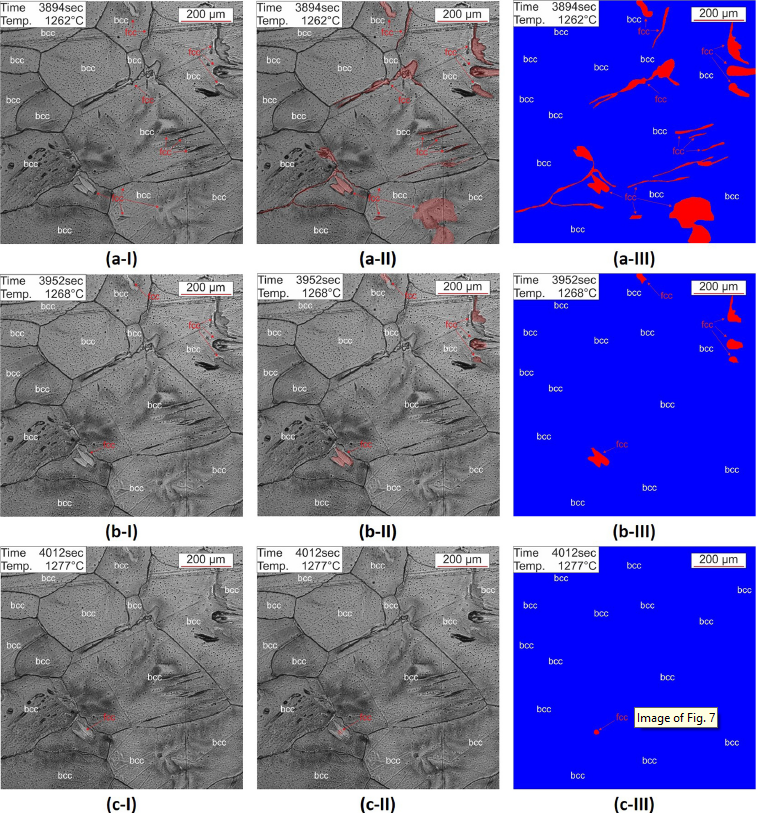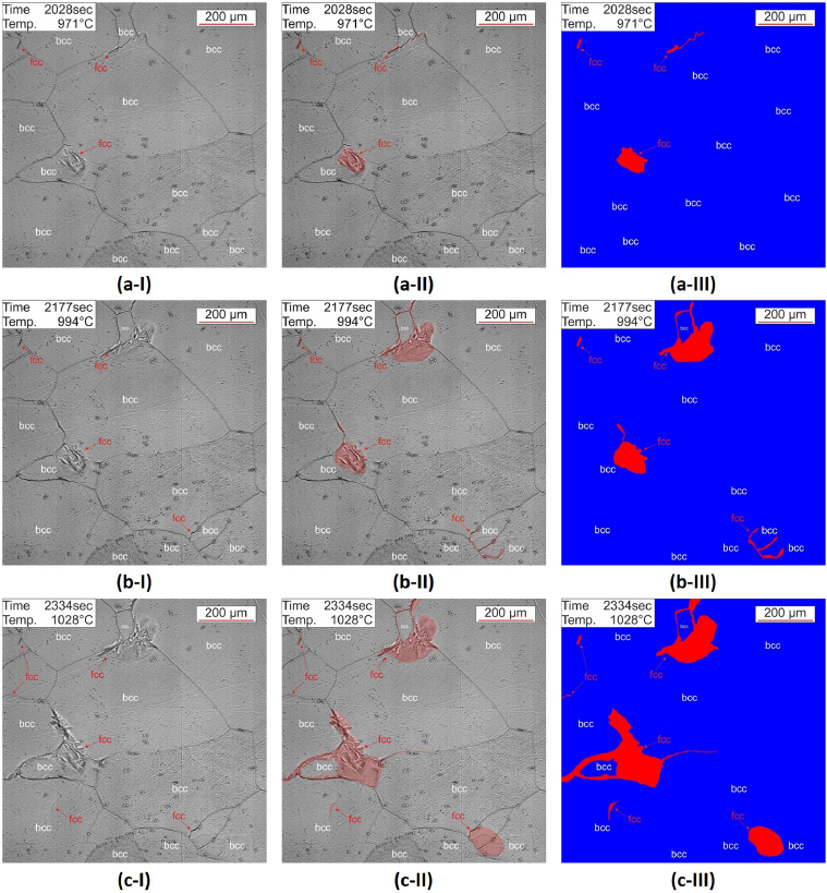 在 971℃(a-I)、994℃(b-I)和 1028℃(c-I)温度下的体心立方↔ 体心立方 + 面心立方相变的高温共聚焦图像;