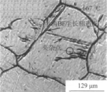 结果表面:薄带连铸低碳钢原始奥氏体晶粒粗大,平均粒径为200μm,室温组织主要由贝氏体和多边形铁素体组成;如下图所示,在过冷奥氏体组织转变过程中,BF板条主要形核位置为原奥氏体晶界上、奥氏体晶内夹杂处、晶界多边形铁素体或已生长的BF板条上,并且后形核生长的BF板条不会穿过先形核生长的BF板条,前后形核生长的BF板条有一定的取向角度;BF板条的生长速率受温度、形核位置和生长取向的影响。