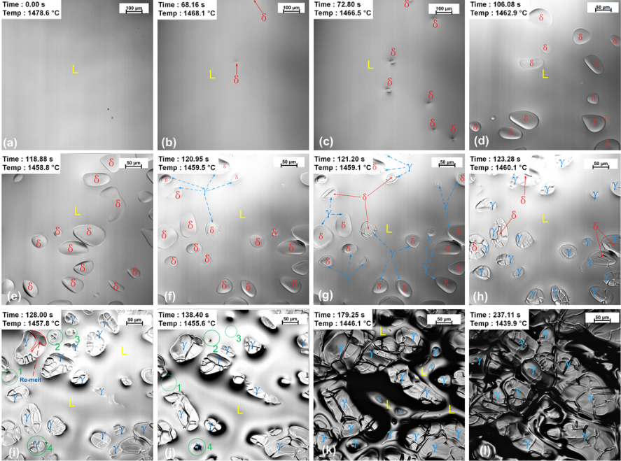 图f,当温度降至1459.5℃时,δ/L界面上形成了一层薄薄的γ-Fe相,表明发生了包晶反应(L+δ- fe→γ-Fe);