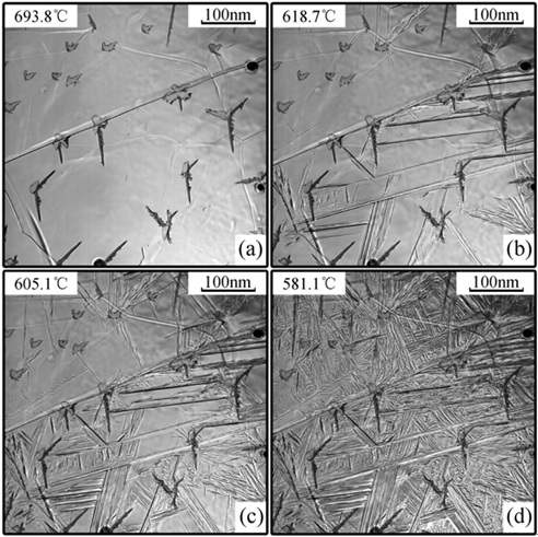 1.当试样冷却到693.8℃的视野上可见有蝴蝶状新相生成,据马氏体形态学推断,应为马氏体,其中较大体积的一些蝶状马氏体两翼相交处有表面材料破碎现象,估计是由较大的切变应力造成,同时因表面破碎释放了马氏体转变的应变能,阻止了蝶状马氏体进一步长大;未转变部分可见隐约的浮凸,是马氏体切变应力在母相奥氏体中造成塑性变形;在抛光痕迹上可见有连串的新相生成,且相对体积较大,说明表面缺陷对马氏体新相生成的促进作用。