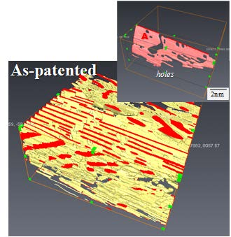 如下图(左),珠光体微观结构的3D重建。图片显示在渗碳体片层上有许多孔洞和裂缝。随着退火周期的延长,渗碳体片层逐渐分解为带状,然后分解成棒状。最后,渗碳体形态从棒状转变为球状。