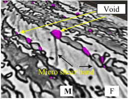 如下图(右),DP钢在韧性断裂过程中,在条状马氏体区和铁素体区优先形成相对粗糙的微裂纹(M:马氏体,F:铁素体),然后该裂纹形成一个微剪切带,随着应变的增大,沿微剪切带形成二次裂纹,最终两次裂纹连接导致断裂。