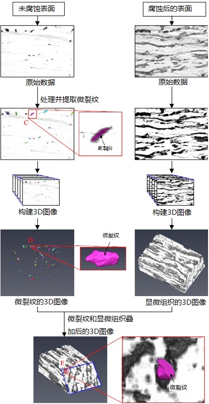 利用全自动逐层切片成像系统对铁素体-珠光体钢中微裂纹与微观结构之间的关系进行了三维观察。采用硝酸腐蚀前后两种显微照片,分别获得微裂纹和微观结构的三维图像。两个三维图像叠加后发现,微裂纹出现在铁素体-珠光体边界处,并扩展到珠光体晶粒内。