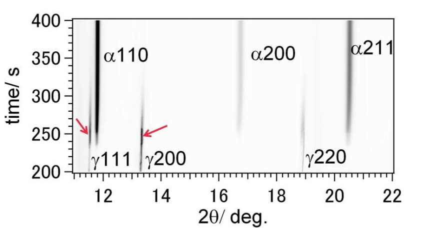 如图3所示,为与图2同步记录的x射线衍射数据。在冷却过程中,由于晶格的收缩,所有的数据都转移到更高的角度。在马氏体相变过程中,出现了α110, α200和α211的反射,这个时间与图2中原位观察的结果是一致的。