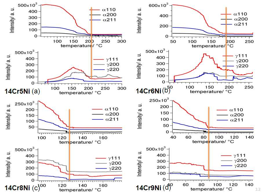 如图4所示,为不同镍含量的铬镍钢马氏体相变时各反射强度变化对比。纵线表示MS温度。