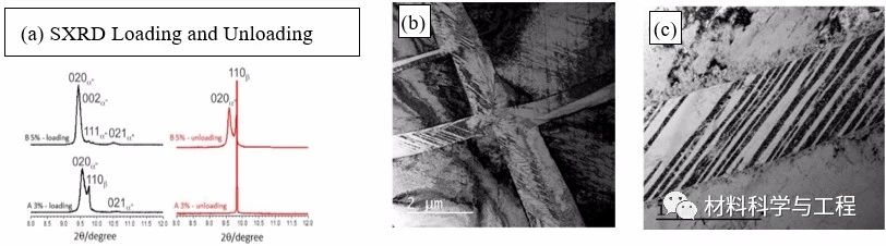 在这项工作中,研究人员首先采用高能同步辐射在SXRD谱线中观察到了近乎完全的应力诱发α’’马氏体相变,随后采用采用高分辨透射电镜观察变形组织,得到了多层级的β变形孪晶形貌,具体如下图所示。