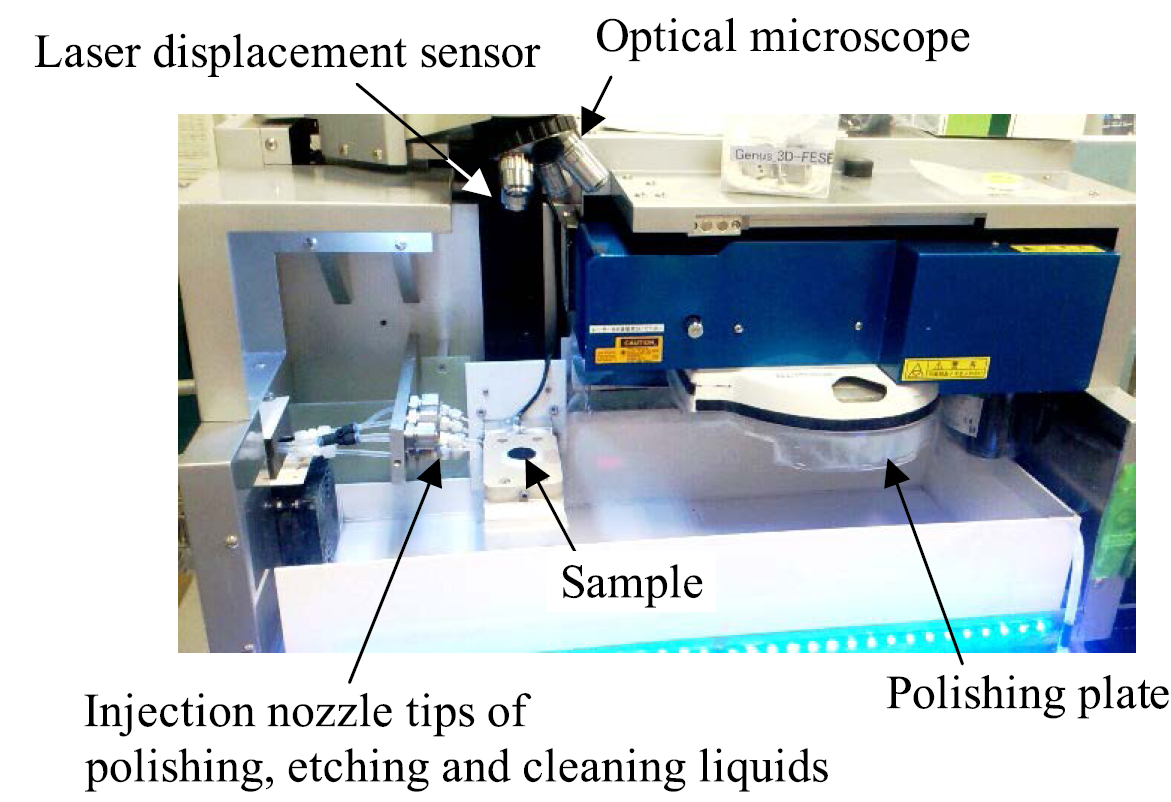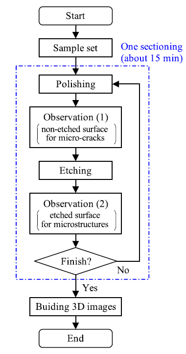 采用三维逐层切片观察技术对试件的微裂纹进行了测量。用的是Genus_3D,是一种全自动的逐层切片成像设备(图12所示)。在逐层切片过程中,用1%硝酸浸蚀试样,并分别对腐蚀前和腐蚀后的试样进行拍照。在下面的描述中,对未蚀刻表面和蚀刻表面的观察分别称为观察(1)和观察(2)。图13为逐层切片过程流程图。