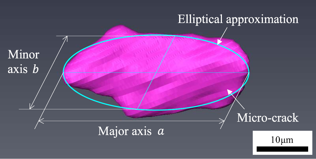 图16为微裂纹透视图,与图14、图15为同一微裂纹。为了表征微裂纹,将微裂纹形状近似为椭圆。被测椭圆的主轴分别为a和b,结果表明,a的分布与d接近,但在长度小于10 μm的范围内,由于观测精度的原因无法测量微裂纹。结果还表明,b分布在d和t之间。