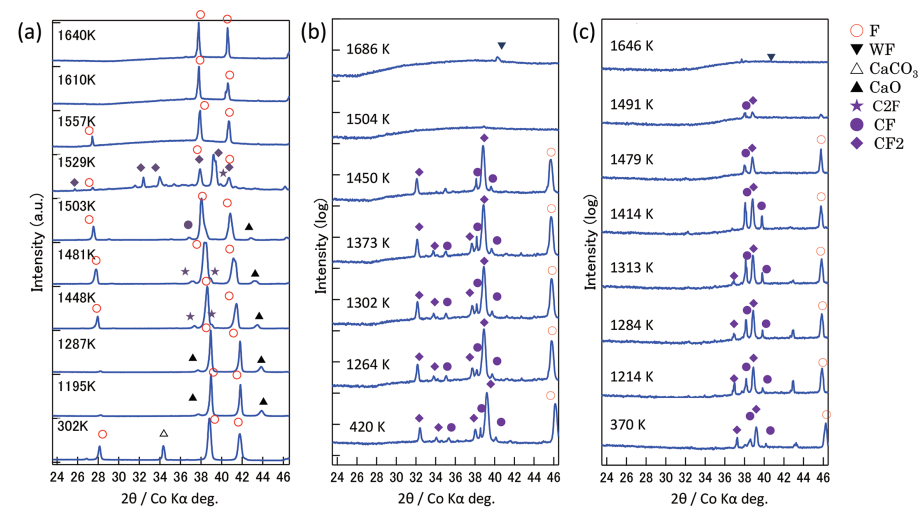 如图2(a)所示,Fe90Ca10以5.0×10-1K/s的升温速度从300K加热到1773K时的升温过程中原位X射线衍射图像。