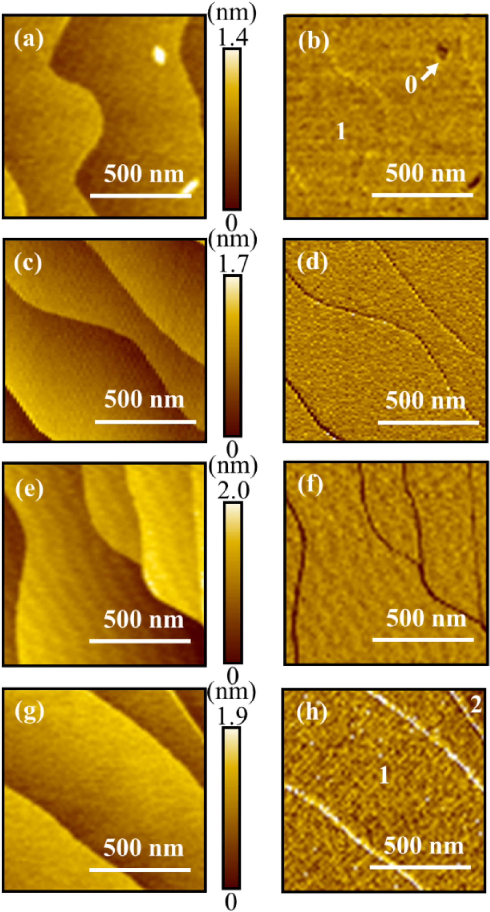 图6.退火石墨烯生长的SPM图像。(a)和(b)退火温度为1600℃,(c)和(d)退火温度为1620℃,(e)和(f)中的退火温度为1650°C,(g)和(h)中的退火温度为1700℃。(a)、(c)、(e)和(g)显示形貌图像,(b)、(d)、(f)、(h)为相位图像。