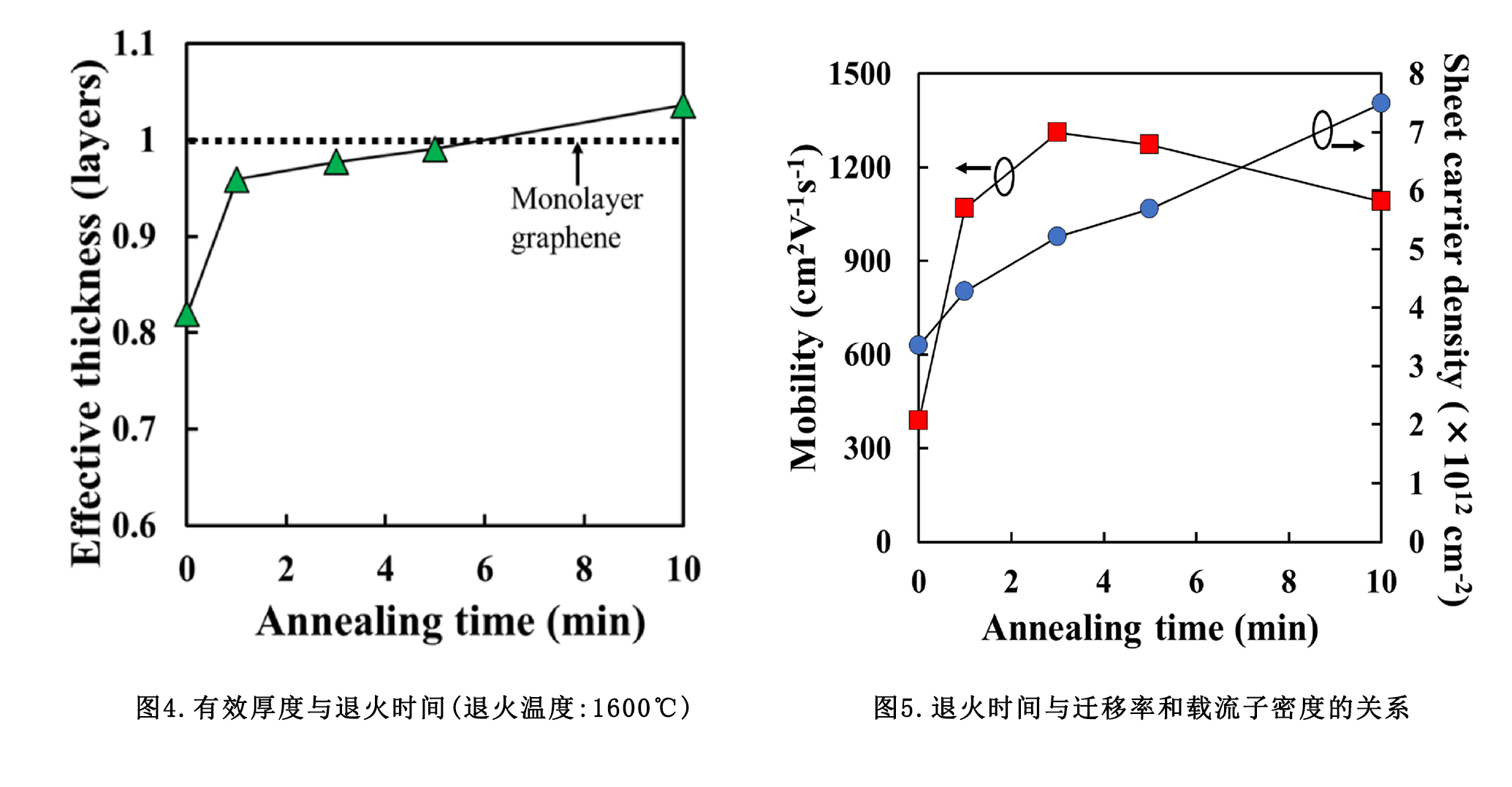 图5显示了样品在1600℃下,不同退火时间与迁移率和载流子密度的关系。