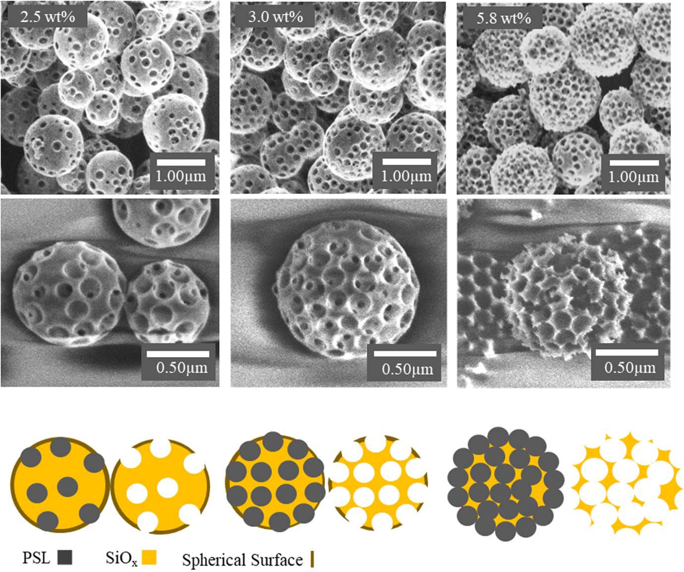 图2 不同浓度的条件下,雾化加热制备的多孔SiOx纳米颗粒的SEM图像和多孔SiOx纳米颗粒的形成示意图。