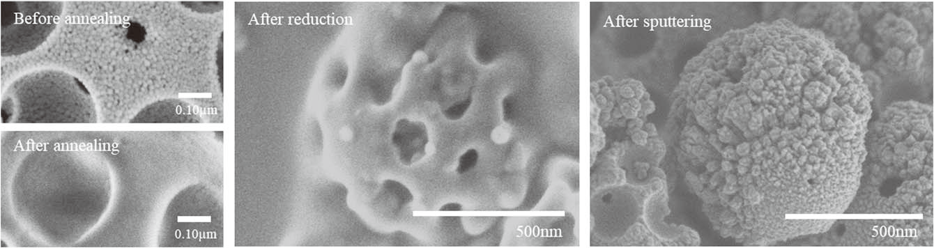 经过高真空退火后,颗粒表面变得更加光滑平坦,说明SiOx纳米颗粒在退火过程中发生了表面熔化,增加了SiOx粉末之间的连接,因此,整个多孔的纳米颗粒会被加强。