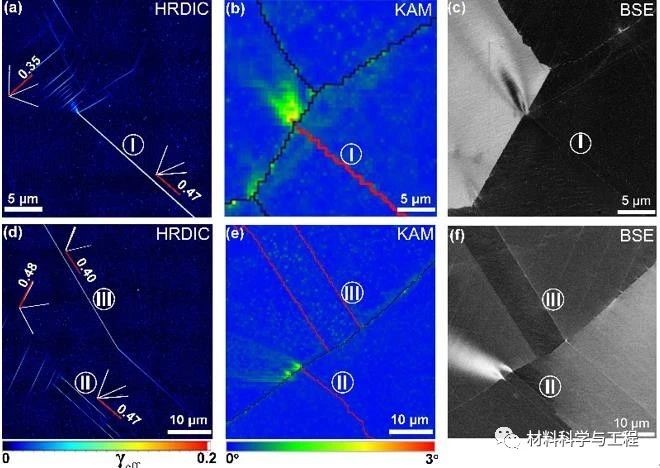 图 1 HRDIC应变图和对应的KAM取向分布图和BSE图揭示孪晶界处显著的应变局域化: (a)-(c)为同一区域,(d)-(f)为同一区域。