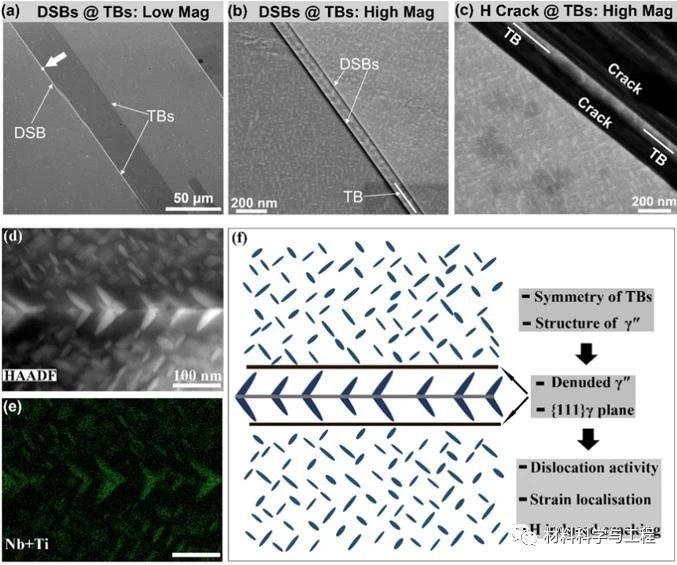 图2 孪晶界(TBs)上V字形γ″相,以及由V字形γ″相导致的位错滑移带(DSBs)优先开动与氢致裂纹萌生扩展