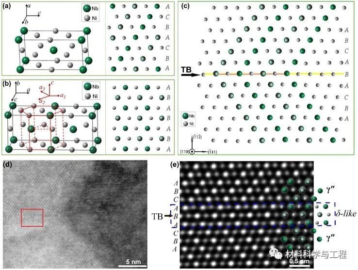 图3 γ″相(a)和δ相(b)的原子分布,跨过孪晶界两侧的原子结构图(c),以及高分辨STEM图表明孪晶界上三层原子形成了类δ相结构 (d,e)