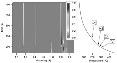 图2.d-间距,强度,时间和温度图(TRXRD)
