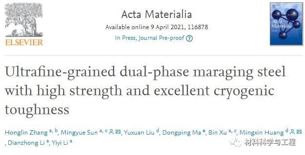 相关论文以题为“Ultrafine-graineddual-phase maraging steel with high strength and excellent cryogenic toughness”发表在Acta Materialia。本文第一作者为中科院金属所博士生张洪林,通讯作者为中科院金属所孙明月研究员和香港大学黄明欣教授,合作者还包括中科院金属所徐斌项目研究员、李殿中研究员和李依依院士,中国空气动力研究与发展中心马东平高级工程师,香港大学博士生刘宇轩。本工作得到国家重点研发计划,国家自然科学基金,中科院重点部署项目和创新交叉团队等项目支持。