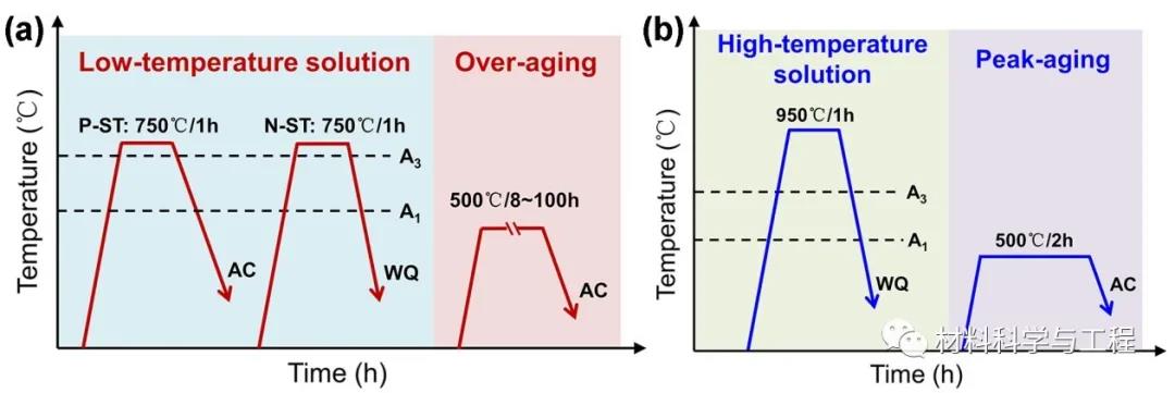 图1 (a)新型热处理工艺路线,包括预固溶(P-ST)、常规固溶(N-ST)处理及500℃过时效处理;(b)常规热处理工艺路线,包括高温固溶及500℃峰时效。