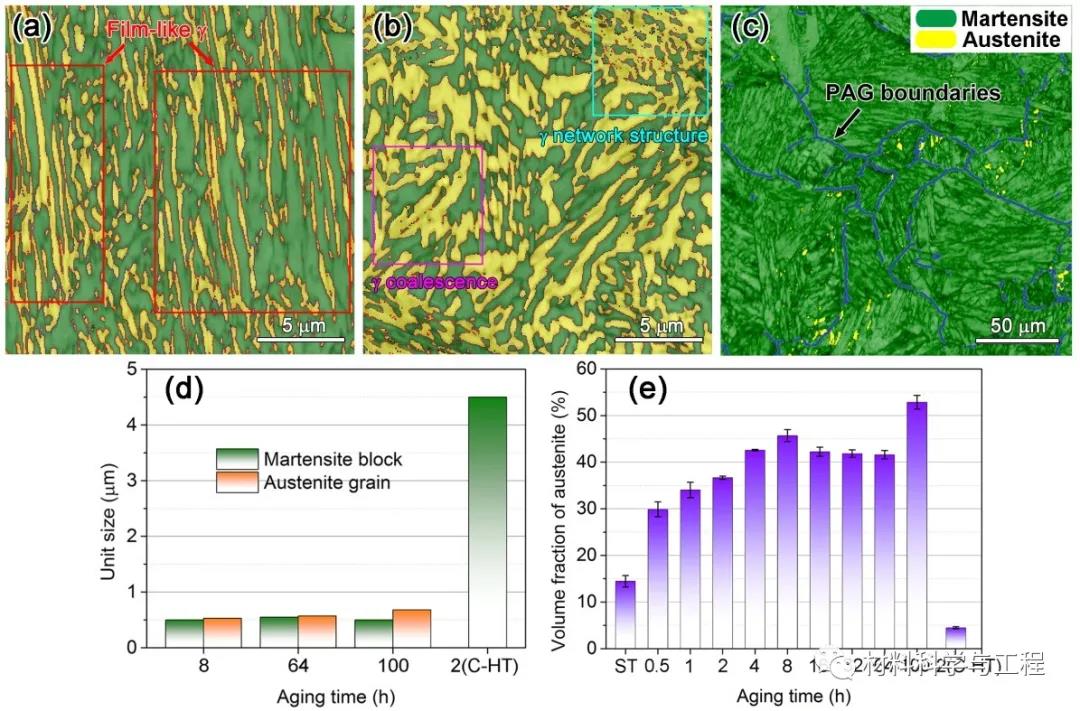 图2 EBSD表征马氏体(绿色)及奥氏体(黄色)双相分布:(a, b)新型实验钢及(c)常规热处理实验钢;不同时间时效后(d)马氏体板条束及奥氏体晶粒尺寸变化,(e)奥氏体含量变化。