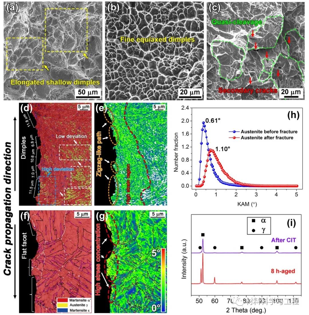 图3 低温断裂特征及韧化机制:(a, b)新型实验钢韧性冲击断口形貌,(c)常规热处理实验钢脆性冲击断口形貌;(d,e, h, i)新型实验钢的TRIP效应增韧;(f, g)常规热处理实验钢穿晶脆性断裂特征。