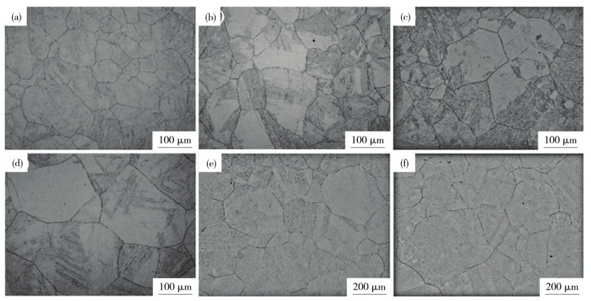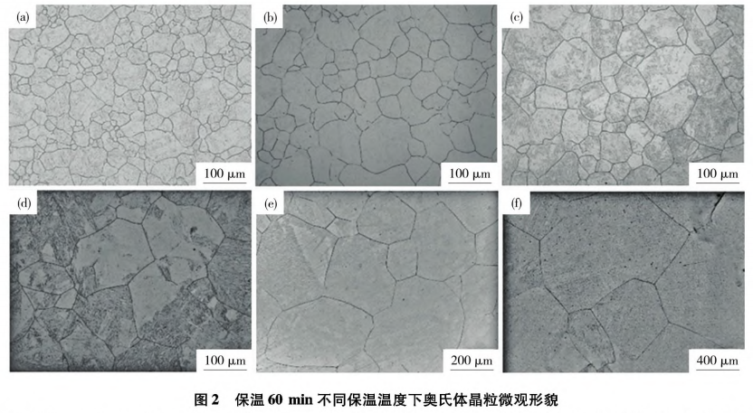 图2为保温60min时,不同保温温度下奥氏体晶粒的微观组织,可以看出,随着温度的增加,晶粒形状由不规则、晶界弯曲的状态(900℃)转变为晶粒形状近似六边形,晶界平直的状态(≥1050℃)。随着温度的升高,奥氏体平均晶粒尺寸(D)逐渐增加。当温度不高于1000℃时,晶粒尺寸变化较小,晶粒尺寸由900℃时的33.87μm,增加到1000℃的65.23μm,如 图2(a)-(c)所示;温度高于1000℃时,晶粒尺寸迅速增大,由1050℃时的125.51μm增加到1200℃的890.12μm,即晶粒严重粗化,如图2(d)-(f)所示。