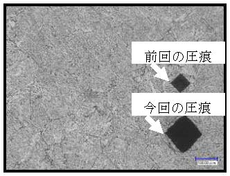 为了观察晶体组织而进行抛光研磨,用2%硝酸酒精腐蚀液腐蚀后,用光学显微镜进行观察。光学显微镜使用运动分析显微镜,在300倍条件下拍照。另外,为了在研磨面上重叠图像时成为记号,每进行2次研磨就使用维氏硬度试验机在5kN处留下压痕。A3钢的研磨图像如图6所示。