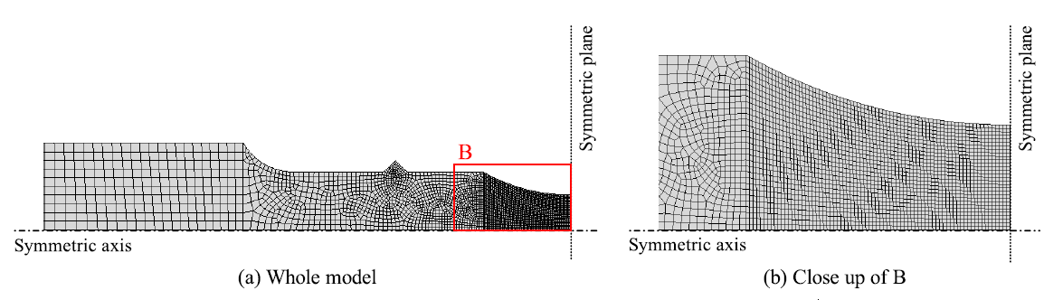 当等效塑性应变达到0.7时,荷载释放。将试件沿轴线方向切割,在试件中心产生一个10mm长的观测试样。