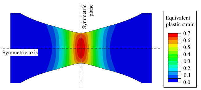 选取对应的材料,进行拉伸实验。实验温度为- 120℃,加载速率为2mm /min。确定了应变片的位移,使最小截面处的等效塑性应变为0.7,因为在不破坏试样的情况下产生微裂纹是必要的。该条件是由考虑轴向和平面对称的有限元模型的弹塑性有限元分析初步确定的。