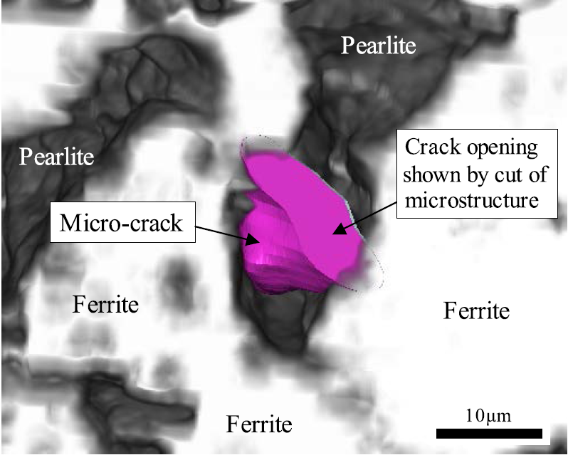 名古屋大学足立教授,使用全自动逐层切片成像系统(Genus_3D),对铁素体-珠光体钢中微裂纹的断裂起始位置进行了研究。