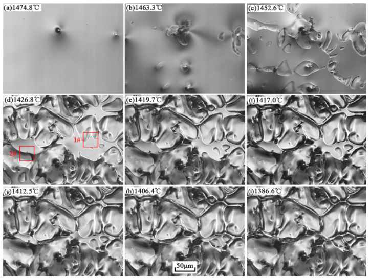 图2-14 样品凝固过程表面变化的原位观察(图d标记1#、2#位置)