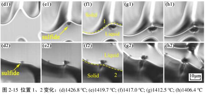 通过图2-15(d1)~(h1)可以清楚的观察到硫化物夹杂在凝固后期的固液界面析出,且硫化物的析出速率先快后慢然后趋向于形态稳定,凝固过程中的硫化物的形成伴随着固液界面的推进。