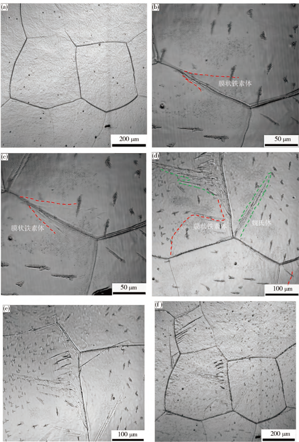 使用高温激光共聚焦显微镜(VL2000DX-SVF17SP,最新型号为VL3000DX-SVF18SP)原位验证观察表明:含NbJ55钢在双相区700℃热装(即高于Ar3温度,简称热装)时,组织为晶界膜状先共析铁素体、魏氏体和大量残留奥氏体,再加热至1200℃,奥氏体晶粒大小、位置都不变;在单相区600℃温装(即低于Ar1温度,简称温装)时,组织为大量铁素体+珠光体,再加热至1200℃时,奥氏体晶粒明显细化。