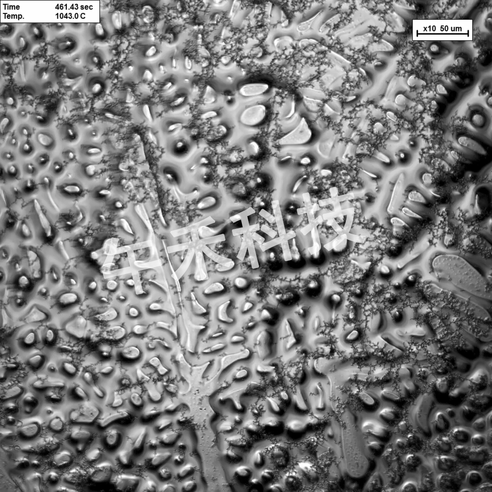 使用超高温激光共聚焦显微镜VL3000DX-SVF18SP,可以研究镍基高温合金的枝晶生长,模拟冷却速率对枝晶演化的影响。结果表明,第二和第三树枝状晶体在较高的冷却速率下茂盛生长,而第一树枝状晶体在较低的冷却速率下呈现良好的生长趋势。
