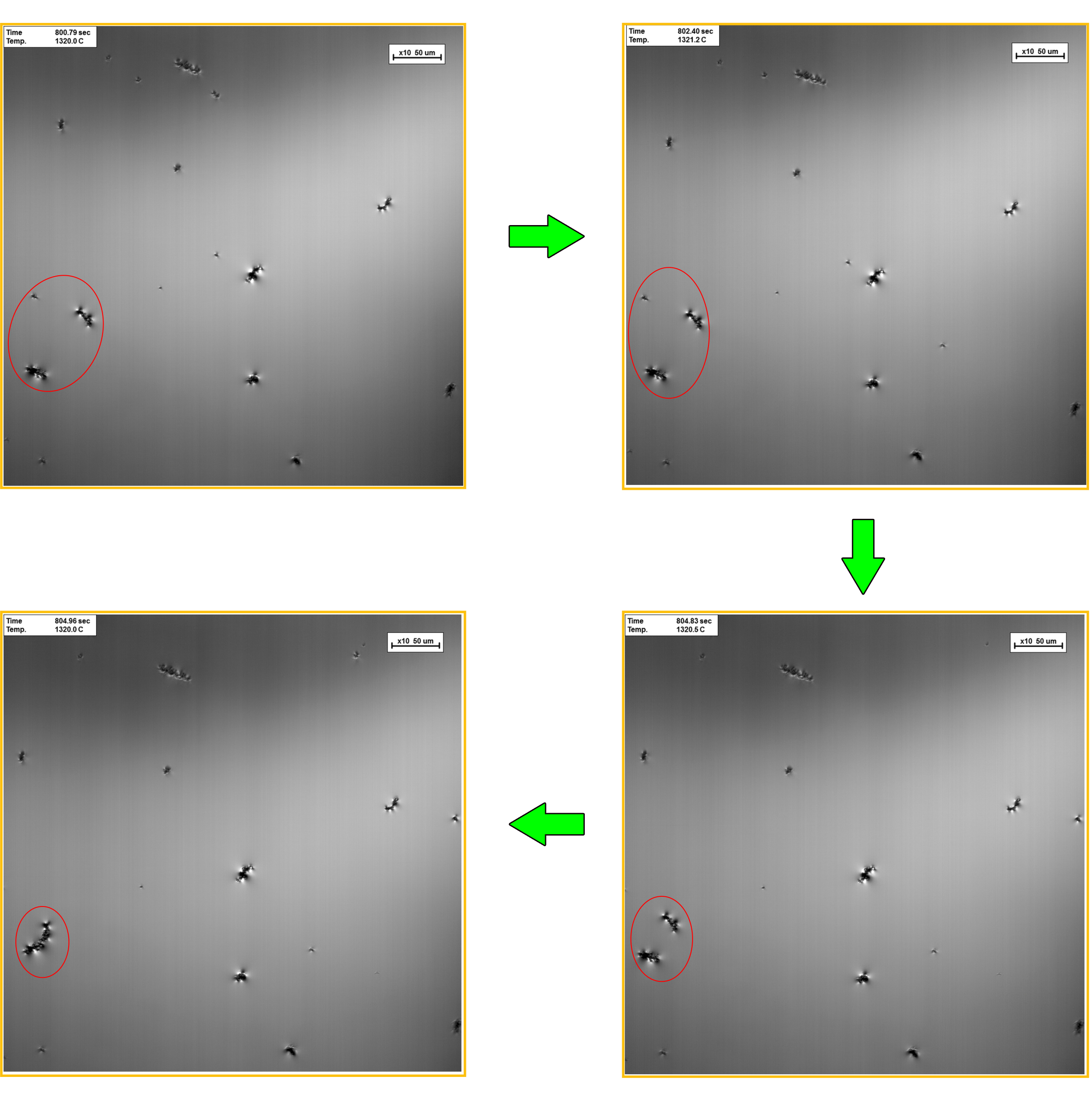 使用超高温共聚焦显微镜VL3000DX-SVF18SP,可以在高温条件下对物理化学现象进行原位观察,在夹杂物控制领域主要应用于研究夹杂物的溶解、碰撞和长大等行为。通过高温共聚焦原位观测精炼渣对夹杂物的吸附过程,能够明确夹杂物在渣中的溶解速率和原理,有助于调整和设计精炼渣成分,为提高精炼效率提供指导。