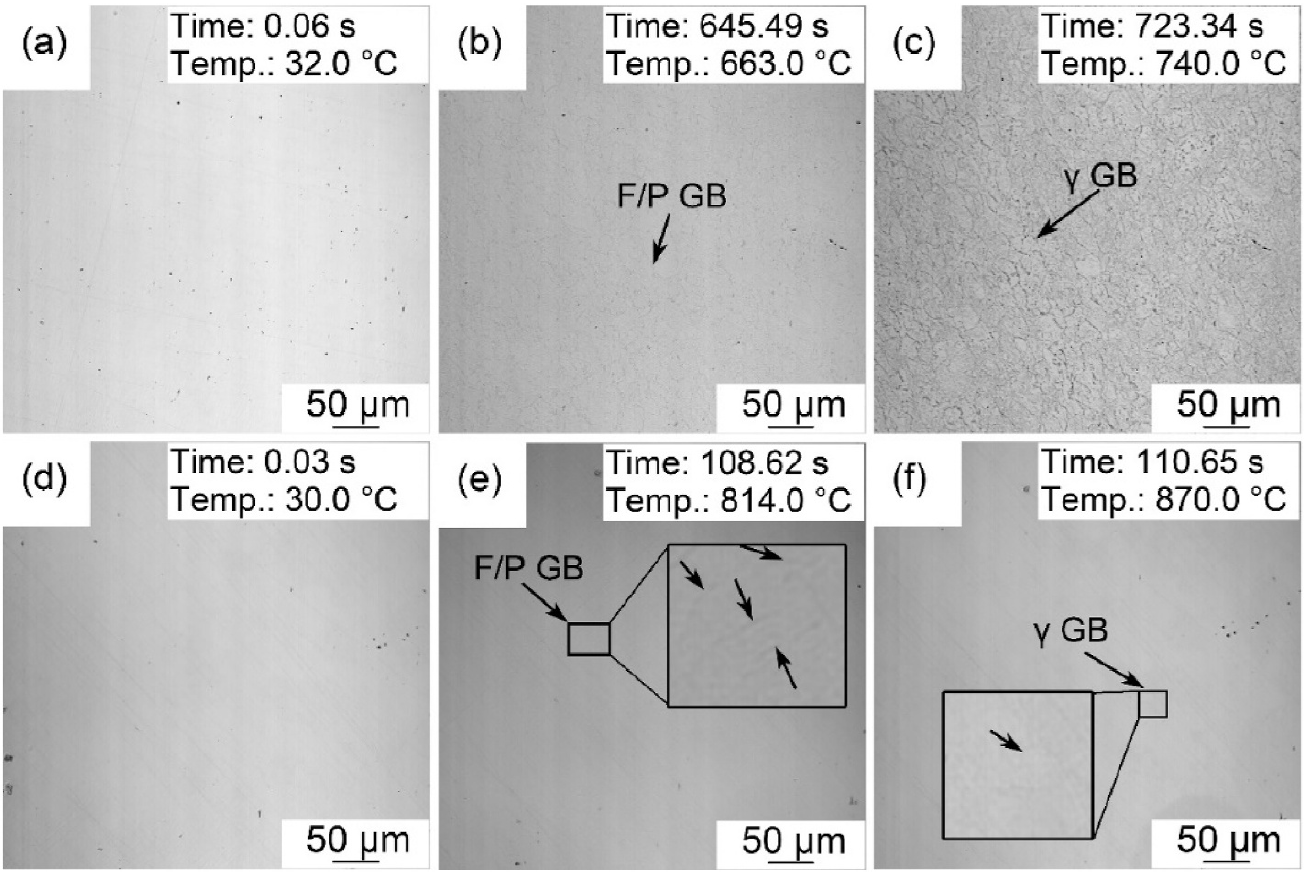 图2 高温原位观察:(a, d)加热前;(b, e)F/P晶界的出现;