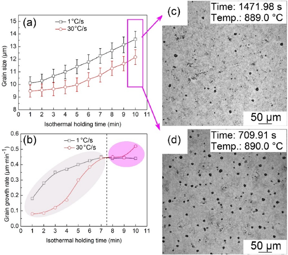 图3(a)试样晶粒尺寸 (b)试样等温保温过程中晶粒的生长速率