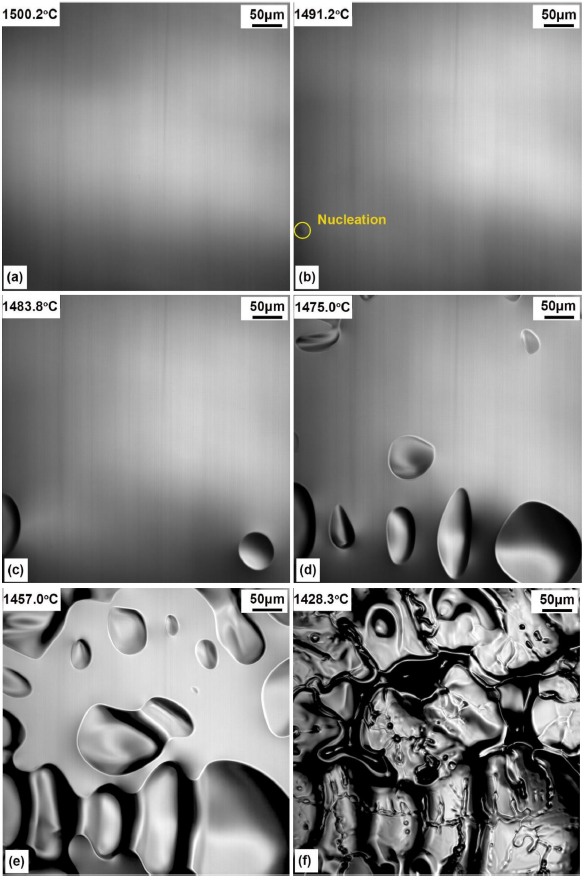 通过高温原位观察到的试样在5℃/min降温速度下的凝固过程