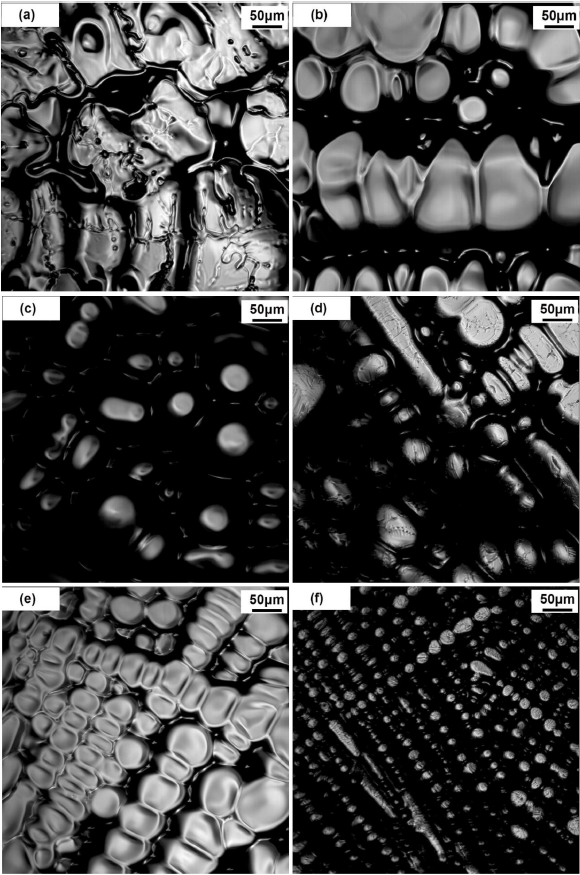 在不同冷却速率下高温原位观察到的枝晶形态。(a)5℃/min,(b)10℃/min,(c)20℃/min,(d)50℃/min,(e)100℃/min,(f)1800℃/min。