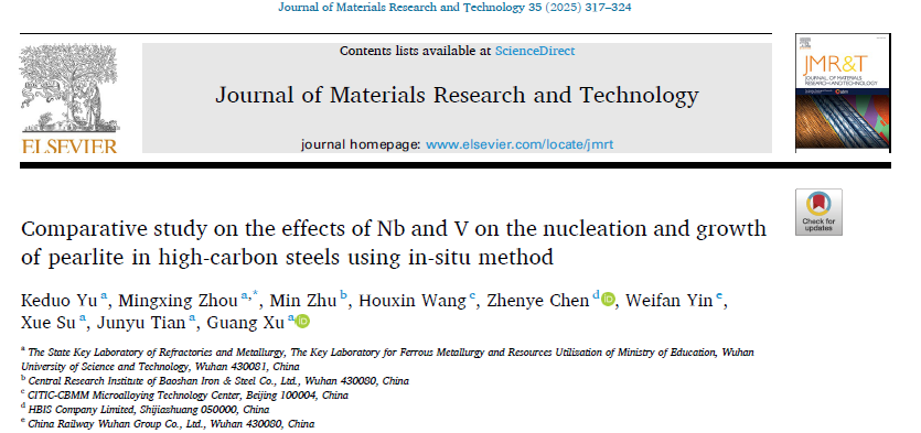 采用高温激光共聚焦显微镜(VL2000DX-SVF17SP)直接观察了三种不同铌和钒添加量的高碳钢中珠光体的形成过程。基于原位观察结果,测量了珠光体团的数密度和生长速率以及珠光体的总体转变动力学。