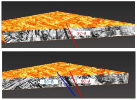 在鹿儿岛大学制作的三维形状图像中,将二次裂纹前端的角度不同的裂纹命名为SC-A、SC-B,并进行了观察。使用EBSD计测周边的结晶方位。