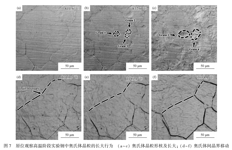 采用高温激光共聚焦显微镜,原位观察焊接热循环过程中组织演变,发现在升温阶段会发生α→γ相变。升温过程中细小的奥氏体晶粒在铁素体晶界处形核,并随着温度的升高逐渐往不同方向扩展,转变早期α相中生成奥氏体晶粒之间相互碰撞不断长大,直至将试样的整个表面都覆盖起来,表明α→γ转变已经完成。