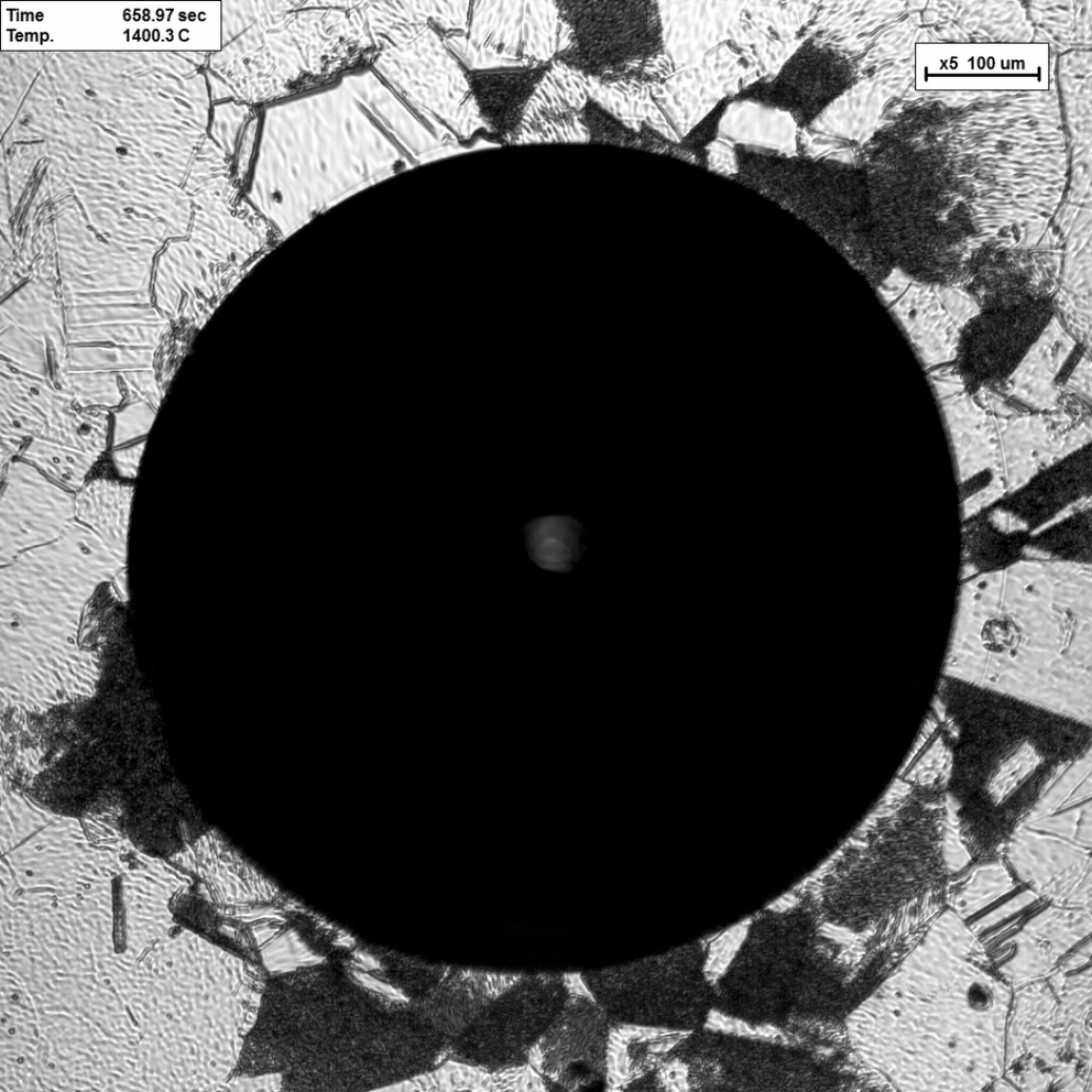 利用超高温激光共聚焦显微镜来测定熔渣在钢表面的铺展情况。可以原位、动态地观察高温下(最高可达1800℃)熔渣在钢表面的铺展、润湿及界面反应过程,这对于解决“凝固钩”问题,能提供最直观的机理证据。